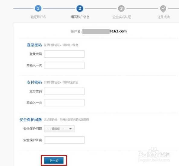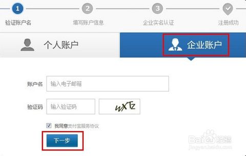 步聚二:點擊【企業(yè)賬戶】,填入電子郵箱和驗證碼(公司賬戶只能郵箱注冊),點擊【下一步】;