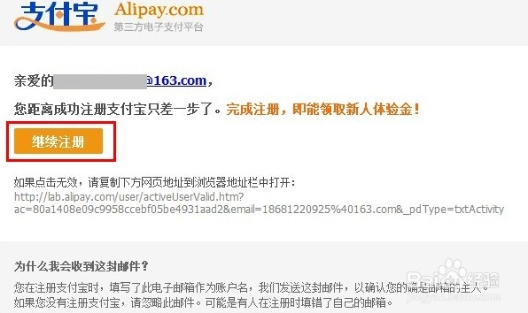 步聚四:在郵箱中會收到一封激活支付寶賬戶的郵件,點擊【請激活您的支付寶賬戶】;