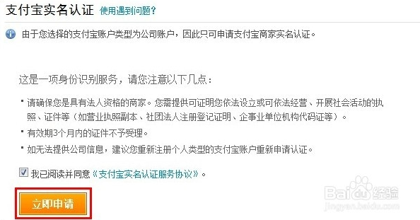 步聚七:申請公司類型的支付寶賬戶,需進(jìn)行支付寶實名認(rèn)證,點擊【立即申請】。