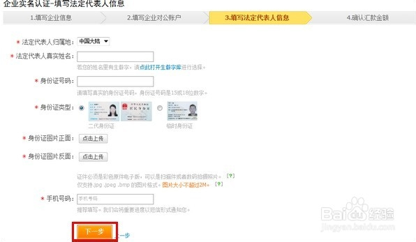 步聚十一:填寫法人信息,上傳法人證件圖片;