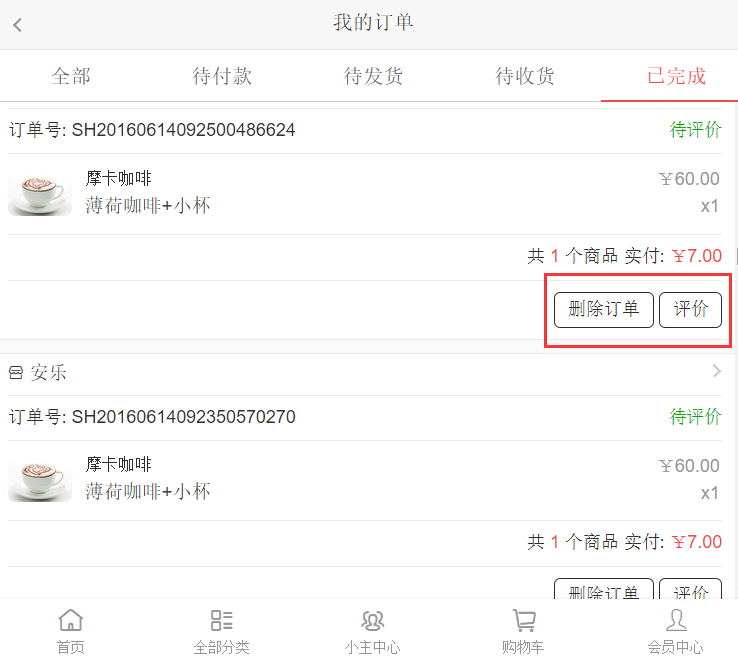 例如:設(shè)置訂單完成7天后可發(fā)起退款或換貨申請(qǐng),則買(mǎi)家或系統(tǒng)確認(rèn)收貨7天內(nèi)(包含當(dāng)天),可發(fā)起售后申請(qǐng),超過(guò)則不允許售后申請(qǐng),只有待評(píng)價(jià)與刪除訂單,參見(jiàn)下圖: