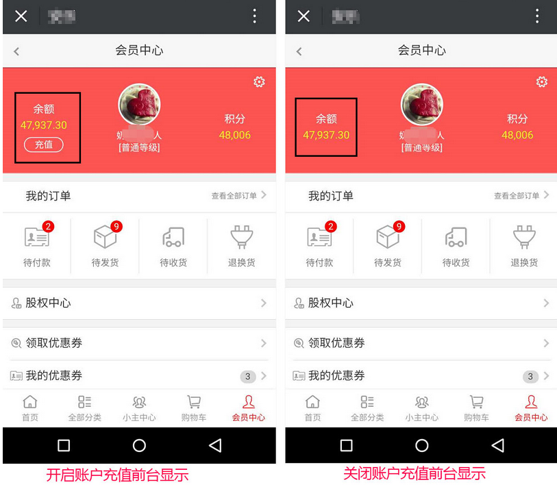 4、開(kāi)啟賬戶(hù)充值,會(huì)員在手機(jī)端就可以進(jìn)行在商城賬戶(hù)余額中進(jìn)行充值金額,反之則不能充值,參見(jiàn)下圖:
