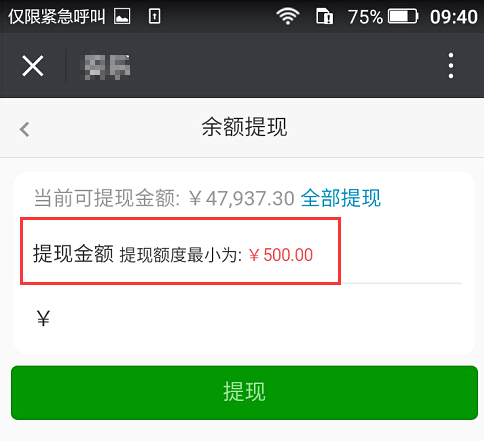 例如:余額提現(xiàn)限制設(shè)置滿(mǎn)500元才能申請(qǐng)?zhí)岈F(xiàn),則只有余額超過(guò)500元的才能申請(qǐng),小于500元的不能申請(qǐng),參見(jiàn)下圖: