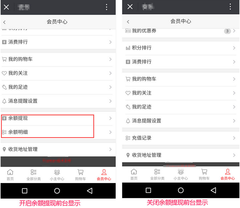 5、開(kāi)啟“余額提現(xiàn)”用戶(hù)才能在手機(jī)端【會(huì)員中心】進(jìn)行發(fā)起余額提現(xiàn)申請(qǐng),關(guān)閉則不能提現(xiàn),參見(jiàn)下圖: