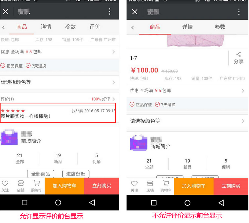 8、選擇是否允許買(mǎi)家評(píng)論商品,允許則買(mǎi)家可評(píng)價(jià),反之則不能評(píng)價(jià),是否顯示買(mǎi)家評(píng)論的信息與是否允許買(mǎi)家評(píng)價(jià)商品相同,參見(jiàn)下圖: