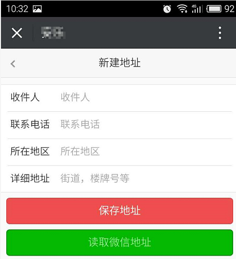 9、開(kāi)啟獲取微信共享收貨地址后,買(mǎi)家購(gòu)買(mǎi)商品添加收貨地址時(shí),可直接點(diǎn)擊“讀取微信地址”,反之則不能讀取,參見(jiàn)下圖: