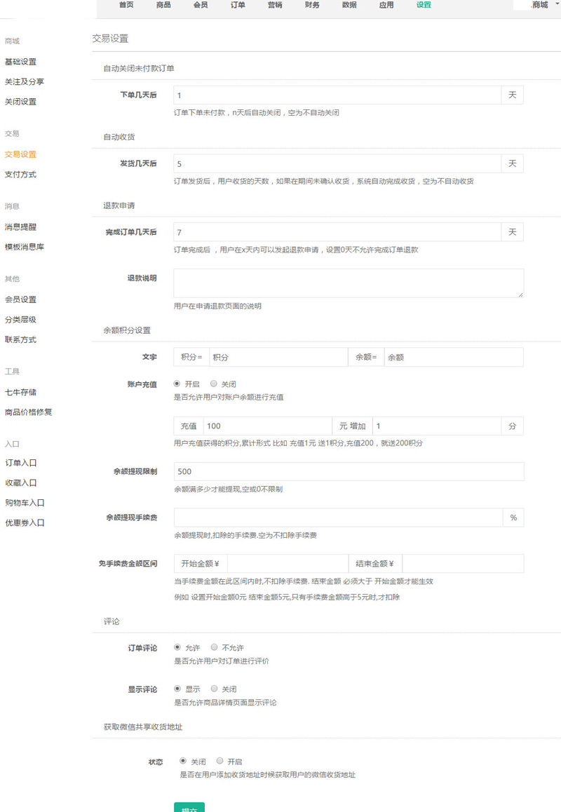 聆科微商城·商城交易設(shè)置
