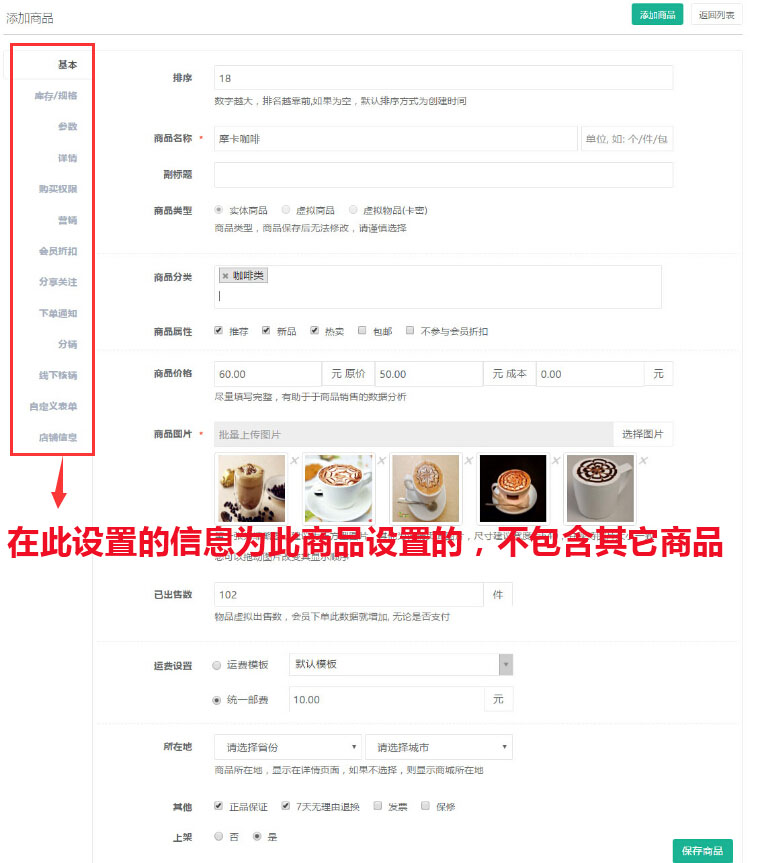 點(diǎn)擊填寫商品的“基本信息”,“購(gòu)買權(quán)限”,“商品營(yíng)銷”等(所有功能設(shè)置僅限于某一商品,不包含商城內(nèi)所有商品的設(shè)置),參見(jiàn)下圖: