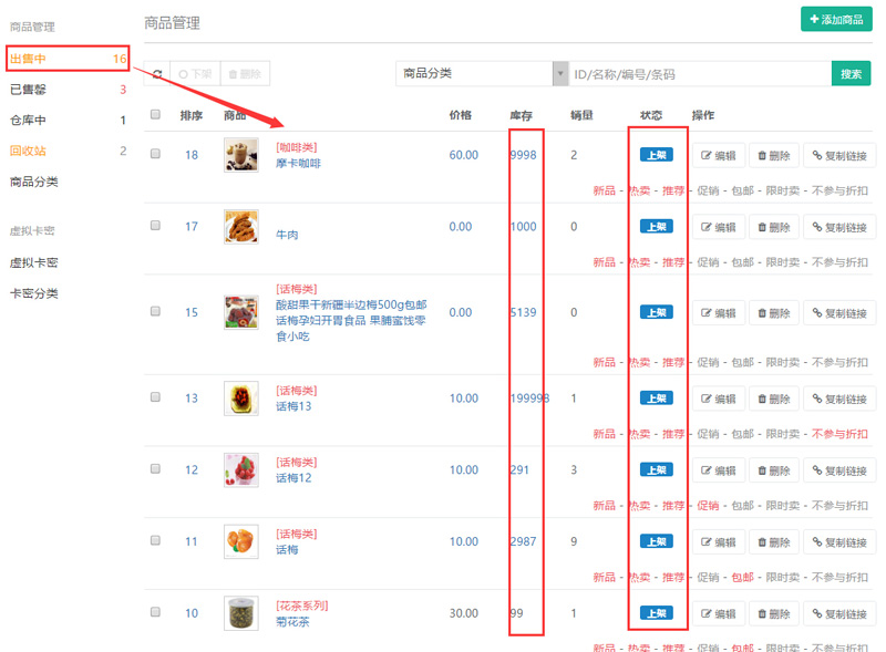 可對(duì)“上架”狀態(tài)的商品,點(diǎn)擊修改庫(kù)存,修改后的商品直接到“出售中”進(jìn)行列示,對(duì)已“下架”的商品,修改庫(kù)存后,商品會(huì)在“倉(cāng)庫(kù)中”進(jìn)行列示,需將商品“上架”才可到“出售中”進(jìn)行銷售。