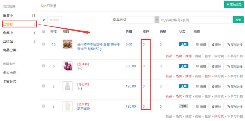 點(diǎn)擊商品在“已售罄”進(jìn)行列示,再次編輯上架進(jìn)行出售,如點(diǎn)擊,則商品將徹底刪除,如需再次出售則需要重新添加商品。