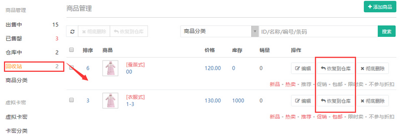 刪除后的商品在中列示,參見(jiàn)下圖: