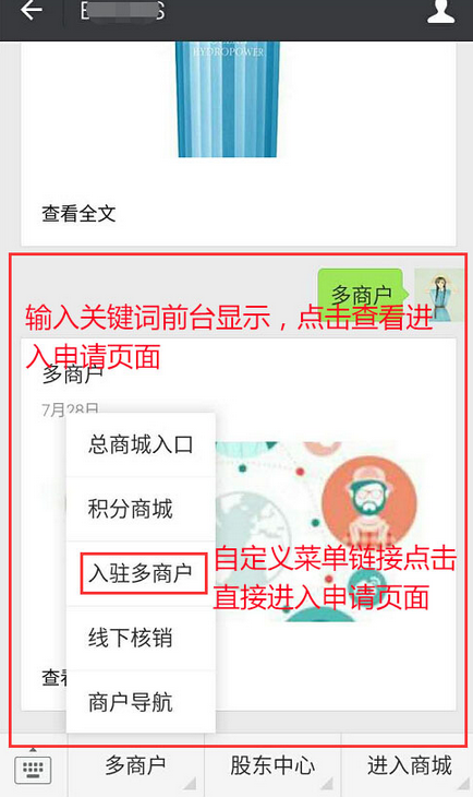 入口的設置有兩種方式,一種是將鏈接復制到自定義菜單,會員在菜單直接點擊即可進入申請入駐頁面,進行填寫資料提交申請,另一種是根據(jù)上商城設置的“關(guān)鍵詞”進入申請入駐頁面,且狀態(tài)必須都是“啟用”,參見下圖: