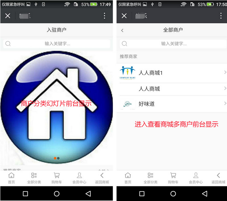 “商戶導航”的入口設置是商城的會員點擊進入查看商城的多商戶,會員可任意點擊多商戶進入店鋪,“商戶導航”入口設置與“申請入駐”入口設置操作相一致,商城可添加“商戶分類幻燈片”,會以滾動圖片的形式顯示在前臺,參見下圖: