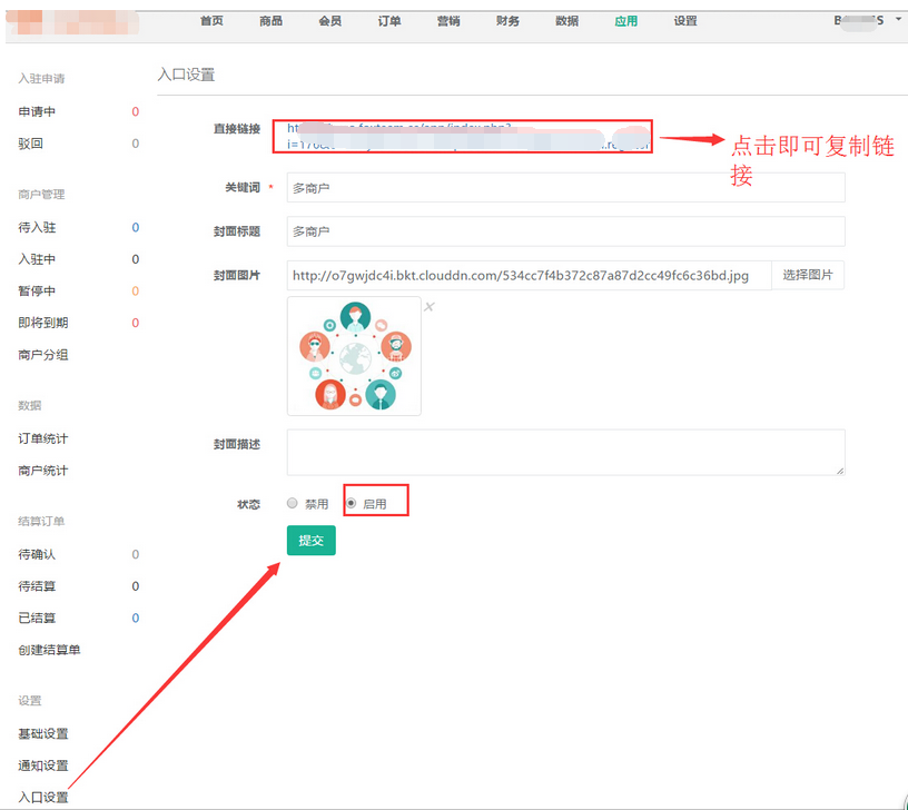 商家首先在【應(yīng)用】——【多商戶】——【基本】中開啟多商戶按鈕,參見下圖: