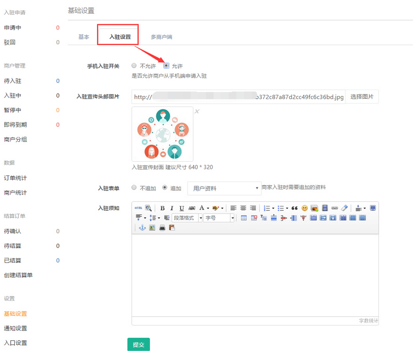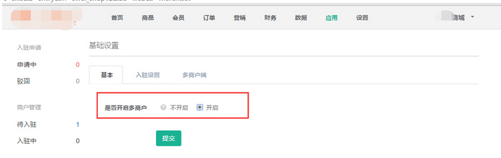 如果會員申請入駐提交填寫的資料后給予“未開啟商戶入駐申請”提示時,是因為選擇的是不允許手機端申請入駐。