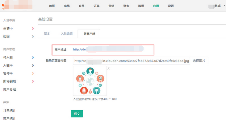 商城處理申請入駐的商家審核通過后,線下將多商戶端登錄后臺的鏈接及商家主賬號通知商家,點擊【多商戶端】將鏈接復制通知商家即可,參見下圖: