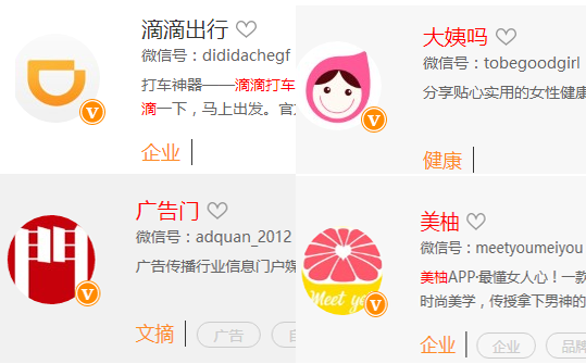 第一,看到嚴(yán)肅的“公司”二字除了聯(lián)想到企業(yè)的廣告新聞,沒(méi)其他了;第二,用戶跟該公司沒(méi)業(yè)務(wù)來(lái)往、利益關(guān)聯(lián),自然就不會(huì)選擇關(guān)注你啦。第三,企業(yè)公眾號(hào)可以用產(chǎn)品名(App名字如滴滴打車(chē),廣告門(mén),美柚,大姨嗎~),前提是你的產(chǎn)品積累一定用戶數(shù),有一定的知名度。