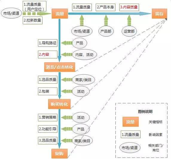 市場(chǎng)或者渠道部門負(fù)責(zé)引流,引流過程中的用戶定位和引流手段會(huì)影響到流量的質(zhì)量,以一定的成本引入質(zhì)量越高數(shù)量越大的流量是市場(chǎng)和渠道部門的工作重點(diǎn)。